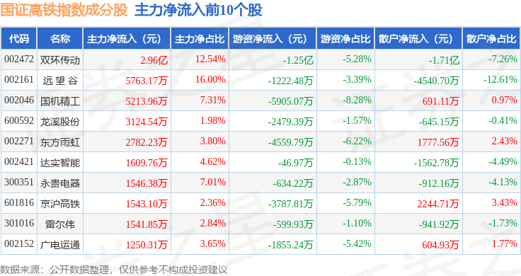 资金流向方面,国证高铁(399419)指数成份股当日主力资金净流出合计7.28亿元,游资资金净流出合计1.87亿元,散户资金净流入合计9.15亿元。成份股资金流向详情见下表: