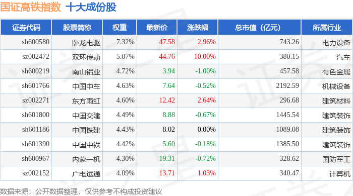 证券之星消息,9月16日,国证高铁(399419)指数报收于2182.18点,涨1.1%,成交277.64亿元,换手率1.05%。当日该指数成份股中,上涨的有31家,雷尔伟以10.32%的涨幅领涨,下跌的有16家,国睿科技以2.19%的跌幅领跌。