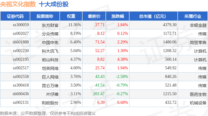 央视文化(399557)指数十大成份股详情如下: