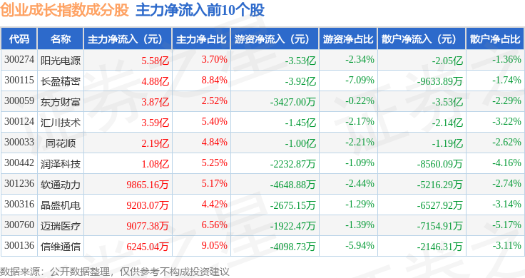 资金流向方面,创业成长(399667)指数成份股当日主力资金净流出合计68.65亿元,游资资金净流入合计14.42亿元,散户资金净流入合计54.23亿元。成份股资金流向详情见下表: