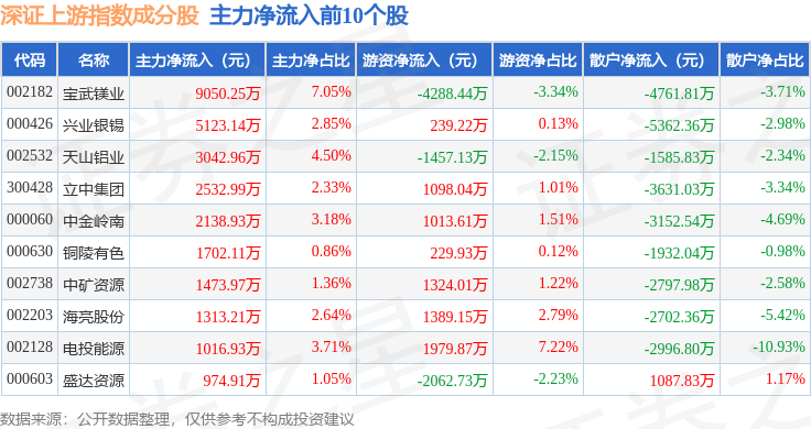资金流向方面,深证上游(399704)指数成份股当日主力资金净流出合计34.99亿元,游资资金净流入合计7.3亿元,散户资金净流入合计27.69亿元。成份股资金流向详情见下表: