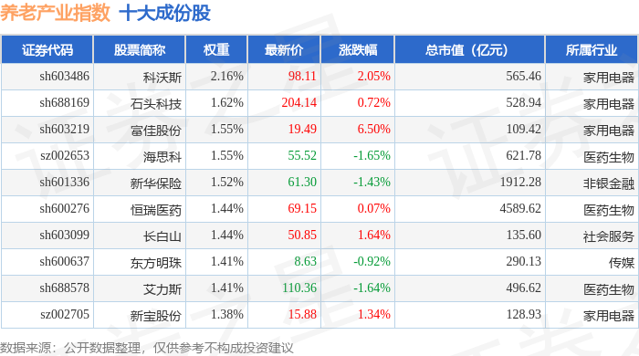 证券之星消息,9月16日,养老产业(399812)指数报收于6692.6点,涨0.1%,成交405.25亿元,换手率1.03%。当日该指数成份股中,上涨的有40家,富佳股份以6.5%的涨幅领涨,下跌的有38家,老凤祥以3.5%的跌幅领跌。