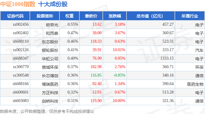 中证1000(399852)指数十大成份股详情如下: