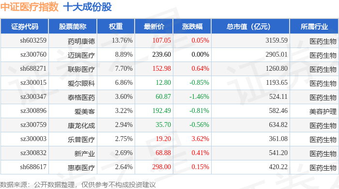 中证医疗(399989)指数十大成份股详情如下: