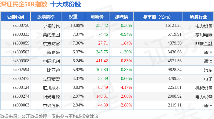 资金流向方面,深证民企50R(470057)指数成份股当日主力资金净流出合计45.32亿元,游资资金净流入合计10.92亿元,散户资金净流入合计34.4亿元。成份股资金流向详情见下表: