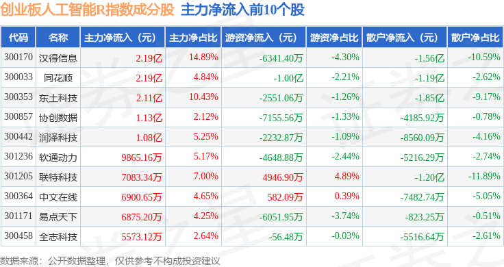 资金流向方面,创业板人工智能R(470070)指数成份股当日主力资金净流出合计28.14亿元,游资资金净流入合计11.34亿元,散户资金净流入合计16.8亿元。成份股资金流向详情见下表: