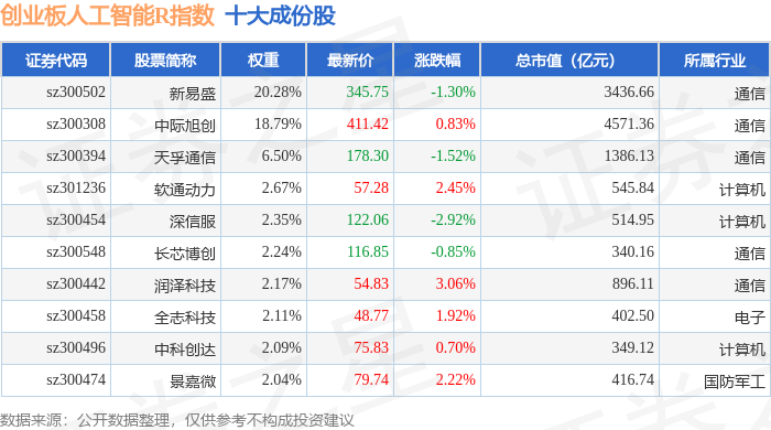 创业板人工智能R(470070)指数十大成份股详情如下: