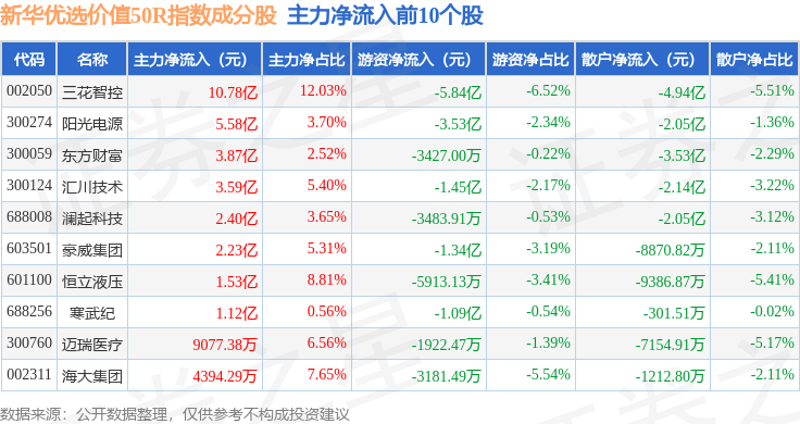 资金流向方面,新华优选价值50R(489004)指数成份股当日主力资金净流出合计88.32亿元,游资资金净流入合计33.76亿元,散户资金净流入合计54.55亿元。成份股资金流向详情见下表: