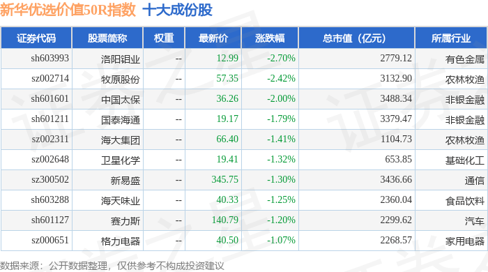 新华优选价值50R(489004)指数十大成份股详情如下:
