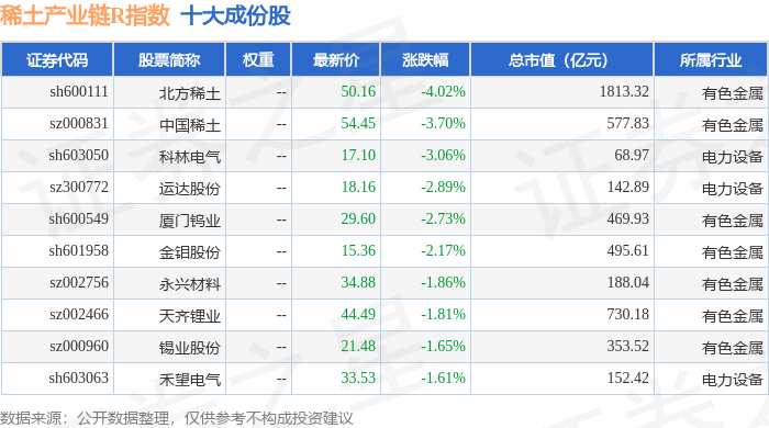 证券之星消息,9月16日,稀土产业链R(489013)指数报收于3765.42点,跌0.08%,成交1036.28亿元,换手率2.56%。当日该指数成份股中,上涨的有13家,科士达以7.22%的涨幅领涨,下跌的有36家,北方稀土以4.02%的跌幅领跌。