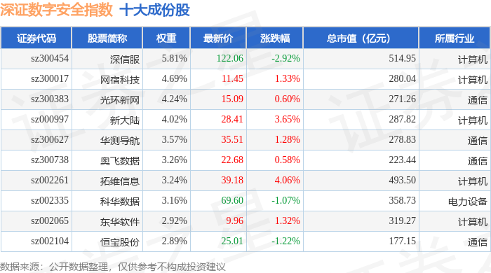 证券之星消息,9月16日,深证数字安全(970052)指数报收于3830.79点,涨1.38%,成交414.7亿元,换手率4.82%。当日该指数成份股中,上涨的有44家,汉威科技以20.0%的涨幅领涨,下跌的有6家,深信服以2.92%的跌幅领跌。