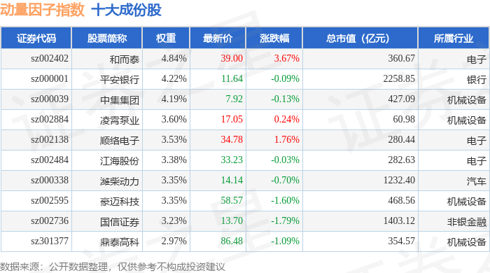 证券之星消息,9月16日,动量因子(980057)指数报收于2286.14点,涨0.84%,成交548.18亿元,换手率2.4%。当日该指数成份股中,上涨的有25家,双环传动以10.0%的涨幅领涨,下跌的有25家,焦作万方以3.34%的跌幅领跌。
