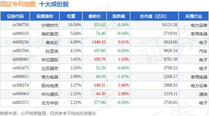 证券之星消息,9月16日,国证专利(980070)指数报收于3573.44点,涨0.09%,成交2220.96亿元,换手率1.29%。当日该指数成份股中,上涨的有41家,三花智控以10.01%的涨幅领涨,下跌的有54家,泽璟制药以5.37%的跌幅领跌。