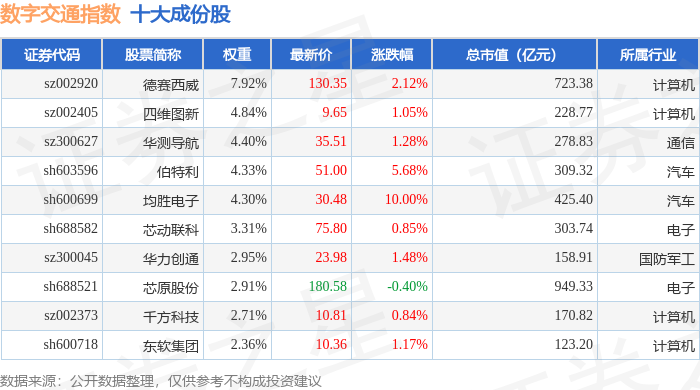 证券之星消息,9月16日,数字交通(980075)指数报收于3369.43点,涨2.12%,成交383.54亿元,换手率2.61%。当日该指数成份股中,上涨的有42家,恒帅股份以20.0%的涨幅领涨,下跌的有8家,国睿科技以2.19%的跌幅领跌。