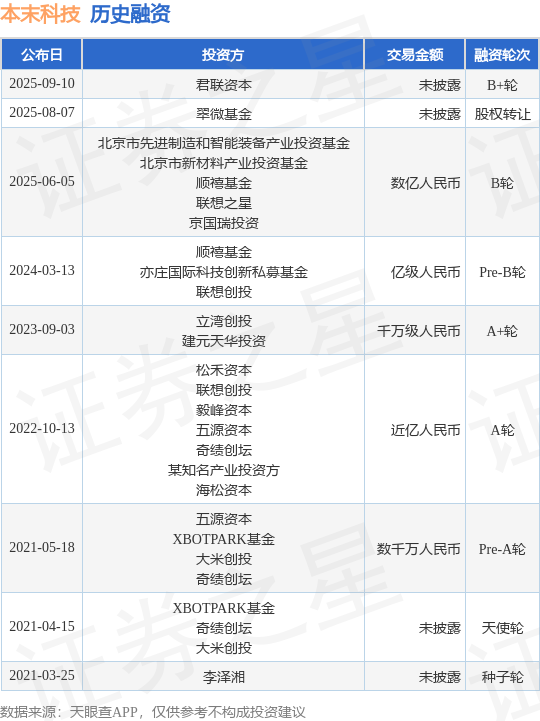 证券之星消息,根据天眼查APP于9月10日公布的信息整理,东莞市本末科技有限公司B+轮融资,融资额未披露,参与投资的机构包括君联资本。