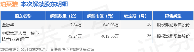 证券之星消息,根据市场公开信息整理,珀莱雅(603605)于9月17日将有57.08万股限售股份解禁,为公司股权激励限售股份,占公司总股本0.14%。(本次数据根据历史公告整理得出,实际情况以上市公司最新公告为准)最近一年内,该股累计解禁60.45万股,占总股本的0.15%。本次解禁后,公司还有2.93万股限售股份,占总股本0.01%。具体如下图所示: