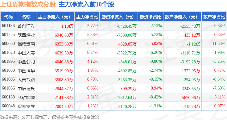 资金流向方面,上证周期(000063)指数成份股当日主力资金净流出合计102.55亿元,游资资金净流入合计43.93亿元,散户资金净流入合计58.61亿元。成份股资金流向详情见下表: