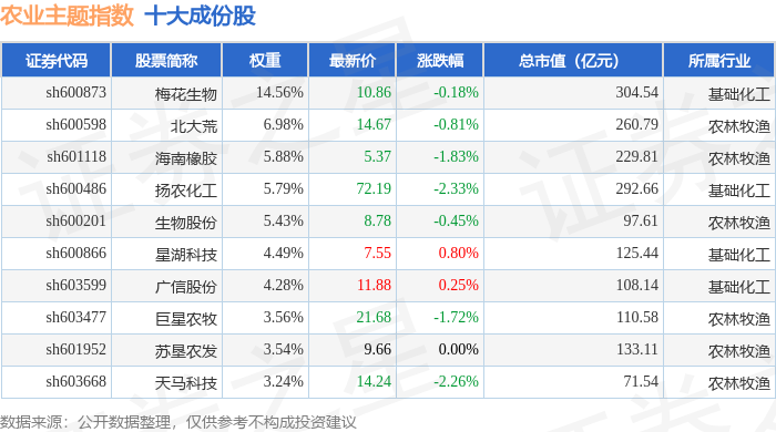 证券之星消息,9月17日,农业主题(000122)指数报收于1606.57点,跌0.76%,成交40.6亿元,换手率1.44%。当日该指数成份股中,上涨的有3家,星湖科技以0.8%的涨幅领涨,下跌的有28家,美邦股份以3.35%的跌幅领跌。