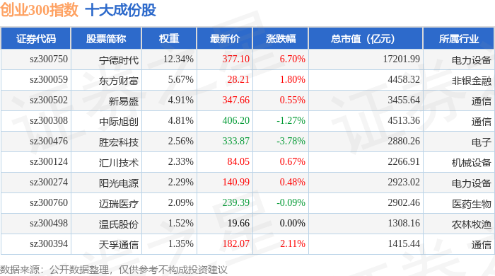 创业300(399012)指数十大成份股详情如下: