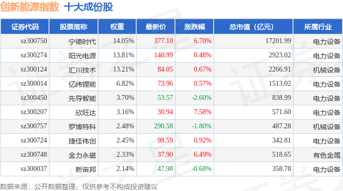 创新能源(399266)指数十大成份股详情如下: