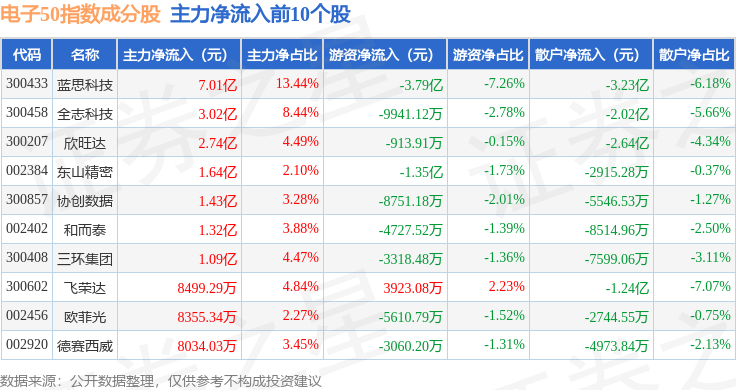 资金流向方面,电子50(399281)指数成份股当日主力资金净流出合计20.5亿元,游资资金净流入合计7.08亿元,散户资金净流入合计13.42亿元。成份股资金流向详情见下表: