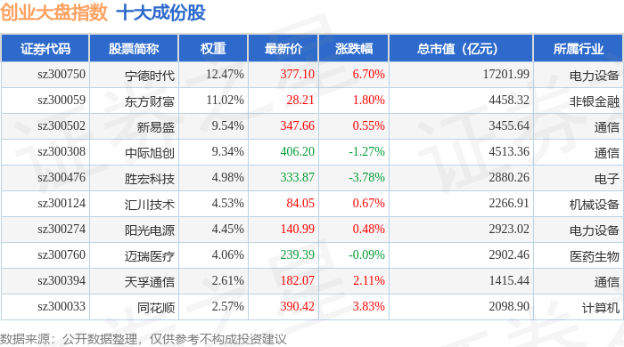 证券之星消息,9月17日,创业大盘(399293)指数报收于6360.84点,涨1.57%,成交2030.67亿元,换手率3.89%。当日该指数成份股中,上涨的有30家,长盈精密以12.44%的涨幅领涨,下跌的有20家,胜宏科技以3.78%的跌幅领跌。