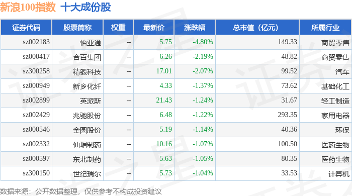 新浪100(399297)指数十大成份股详情如下: