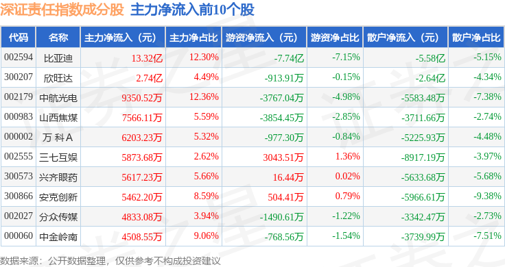 资金流向方面,深证责任(399341)指数成份股当日主力资金净流出合计27.55亿元,游资资金净流入合计4.35亿元,散户资金净流入合计23.2亿元。成份股资金流向详情见下表: