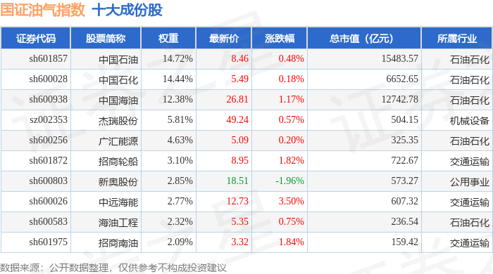 证券之星消息,9月17日,国证油气(399439)指数报收于1728.84点,涨0.23%,成交139.39亿元,换手率0.54%。当日该指数成份股中,上涨的有29家,大众公用以6.59%的涨幅领涨,下跌的有18家,如通股份以2.06%的跌幅领跌。