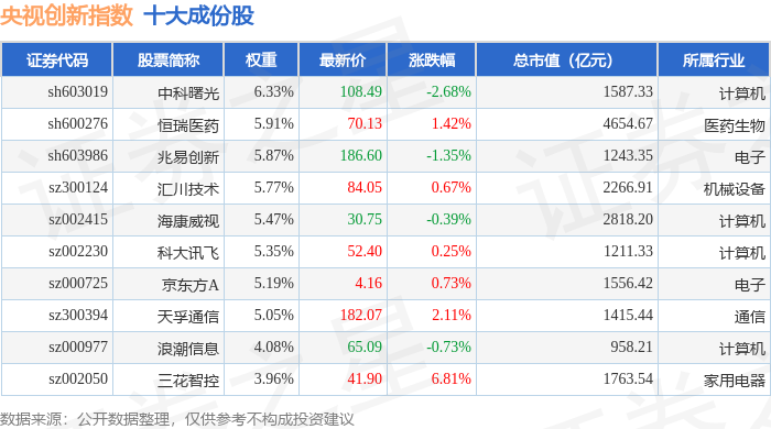 证券之星消息,9月17日,央视创新(399551)指数报收于10300.57点,涨0.87%,成交979.1亿元,换手率2.45%。当日该指数成份股中,上涨的有26家,福晶科技以10.0%的涨幅领涨,下跌的有21家,汉钟精机以3.43%的跌幅领跌。