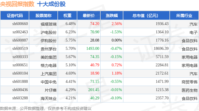 证券之星消息,9月17日,央视回报(399553)指数报收于7545.2点,涨0.29%,成交460.03亿元,换手率1.36%。当日该指数成份股中,上涨的有20家,中鼎股份以6.82%的涨幅领涨,下跌的有29家,古井贡酒以2.94%的跌幅领跌。
