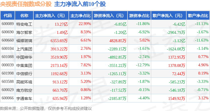 资金流向方面,央视责任(399555)指数成份股当日主力资金净流出合计21.4亿元,游资资金净流入合计8.79亿元,散户资金净流入合计12.6亿元。成份股资金流向详情见下表: