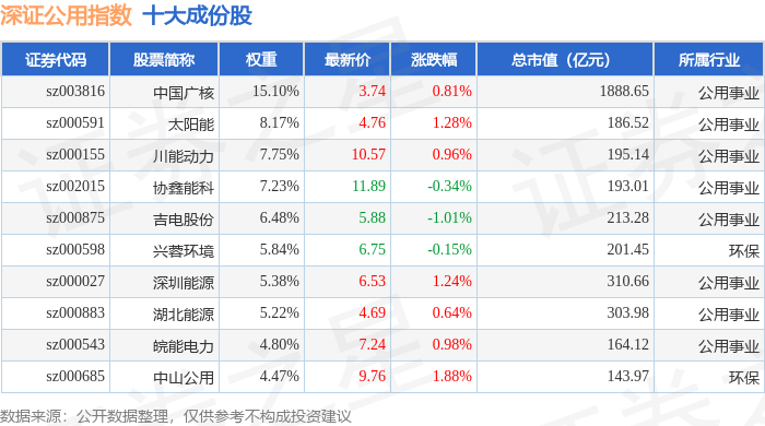证券之星消息,9月17日,深证公用(399622)指数报收于1698.87点,涨0.71%,成交39.94亿元,换手率0.68%。当日该指数成份股中,上涨的有13家,江苏国信以5.66%的涨幅领涨,下跌的有6家,吉电股份以1.01%的跌幅领跌。