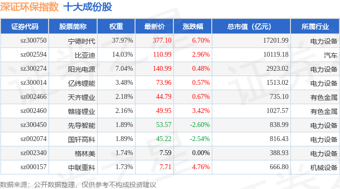 证券之星消息,9月17日,深证环保(399638)指数报收于7212.77点,涨3.44%,成交1119.93亿元,换手率2.2%。当日该指数成份股中,上涨的有30家,欣旺达以7.58%的涨幅领涨,下跌的有7家,先导智能以2.6%的跌幅领跌。