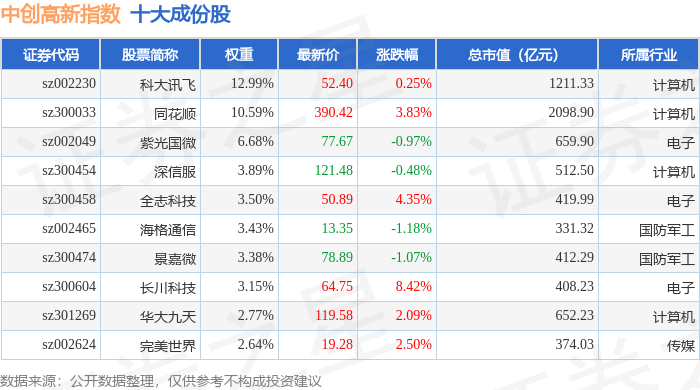 中创高新(399652)指数十大成份股详情如下: