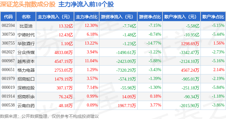 资金流向方面,深证龙头(399653)指数成份股当日主力资金净流出合计35.88亿元,游资资金净流入合计12.55亿元,散户资金净流入合计23.33亿元。成份股资金流向详情见下表: