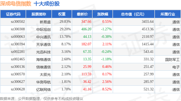 证券之星消息,9月17日,深成电信(399688)指数报收于5379.41点,涨0.01%,成交490.5亿元,换手率3.73%。当日该指数成份股中,上涨的有9家,亿联网络以8.52%的涨幅领涨,下跌的有6家,中际旭创以1.27%的跌幅领跌。