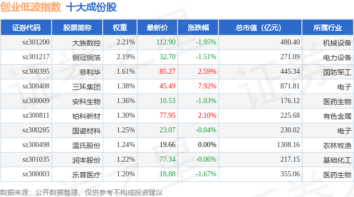 创业低波(399692)指数十大成份股详情如下: