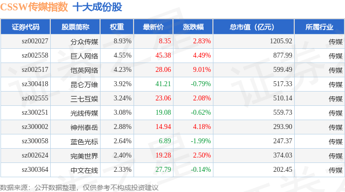 CSSW传媒(399810)指数十大成份股详情如下: