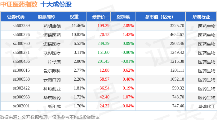 中证医药(399933)指数十大成份股详情如下: