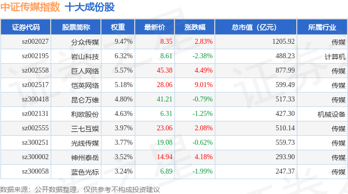 中证传媒(399971)指数十大成份股详情如下: