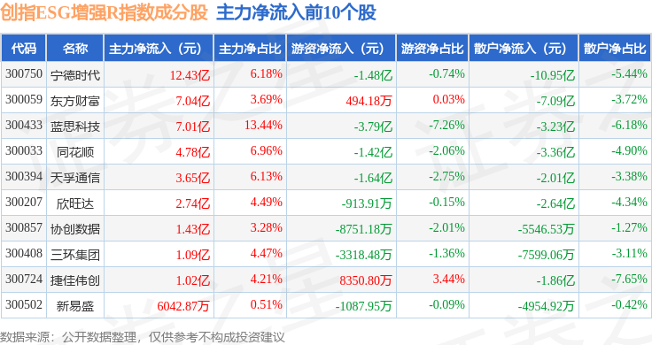 资金流向方面,创指ESG增强R(470034)指数成份股当日主力资金净流入合计6.93亿元,游资资金净流入合计4.64亿元,散户资金净流出合计11.56亿元。成份股资金流向详情见下表: