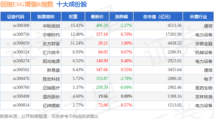 创指ESG增强R(470034)指数十大成份股详情如下: