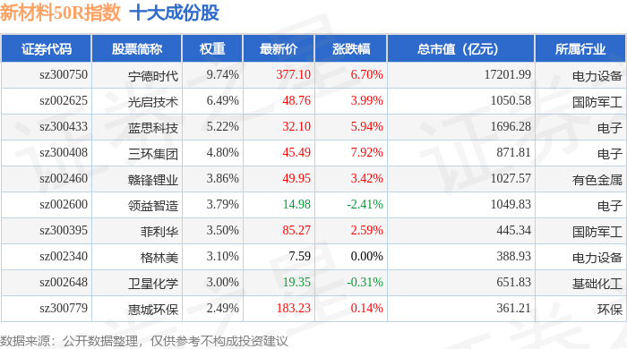 新材料50R(470042)指数十大成份股详情如下:
