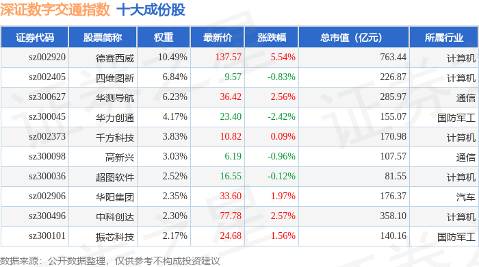 证券之星消息,9月17日,深证数字交通(970049)指数报收于4557.43点,涨1.11%,成交263.61亿元,换手率3.23%。当日该指数成份股中,上涨的有26家,豪恩汽电以14.22%的涨幅领涨,下跌的有24家,佳讯飞鸿以3.86%的跌幅领跌。