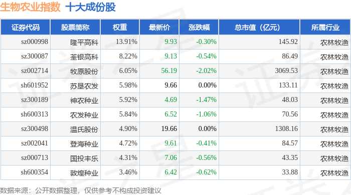 资金流向方面,生物农业(980072)指数成份股当日主力资金净流出合计11.66亿元,游资资金净流入合计1.88亿元,散户资金净流入合计9.77亿元。成份股资金流向详情见下表: