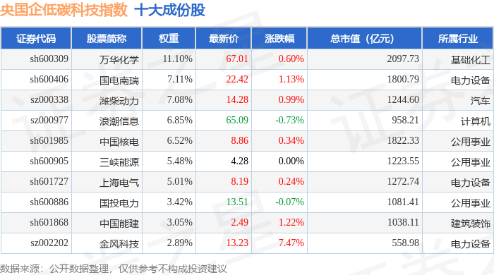 央国企低碳科技(980082)指数十大成份股详情如下: