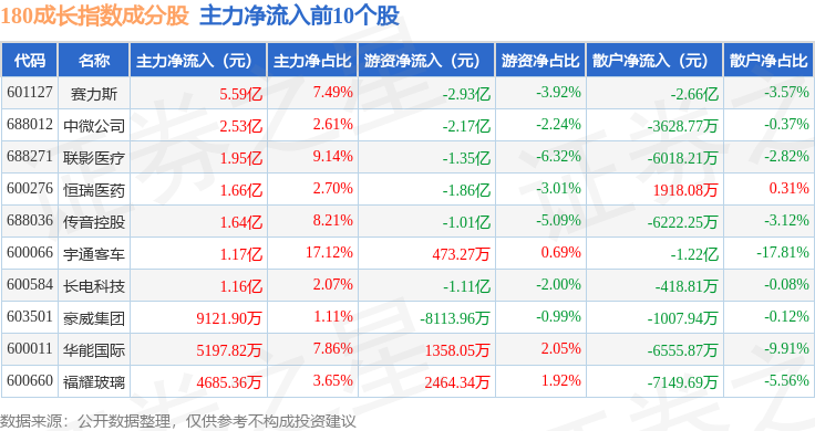 资金流向方面,180成长(000028)指数成份股当日主力资金净流出合计113.8亿元,游资资金净流入合计48.04亿元,散户资金净流入合计65.76亿元。成份股资金流向详情见下表: