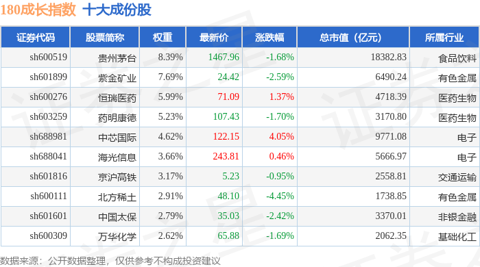 证券之星消息,9月18日,180成长(000028)指数报收于3816.19点,跌0.75%,成交1896.95亿元,换手率1.3%。当日该指数成份股中,上涨的有14家,中微公司以11.43%的涨幅领涨,下跌的有45家,北方稀土以4.45%的跌幅领跌。
