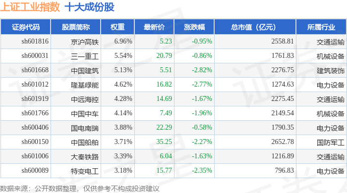上证工业(000034)指数十大成份股详情如下: